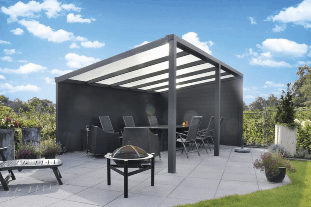Combineer de veranda met (glazen) schuifwanden of windschermen voor extra comfort. Zo creëert u een halfopen of volledig afsluitbare tuinkamer, afgestemd op elk seizoen.